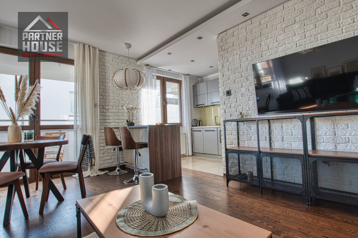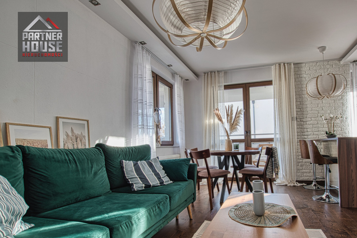 • Salon z aneksem kuchennym i wyjściem na balkon - jasny, ustawny, z dużą ilością naturalnego światła